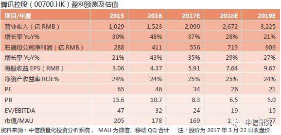 我们认为受益于《王者荣耀》等游戏流水持续走高,以及微信变现能力的深化,公司业绩将在今年维持高速增长。我们维持公司盈利预测,预计2017/18/19年EPS分别为5.91/7.64/9.67元人民币,当前价225.2港元,对应2017/18/19的PE为34/26/21倍。维持公司目标价275港币,维持“买入”评级。