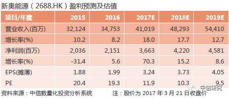 公司天然气销量提速,核心盈利增长符合预期;煤改气及商业用户增长提速,加之接驳将较快增长,上调2017~2018年盈利预测至3.24/3.73元(原为3.09/3.47元),并新增2019年盈利预测4.05元。目前股价对应2017~2019年PE分别为11.9/10.3/9.5倍,考虑到公司成长性(2017~2019年核心盈利增长预计为14.1%/15.2%/8.6%),给予2017年15倍PE,对应目标价54.8港元,维持“买入”评级。