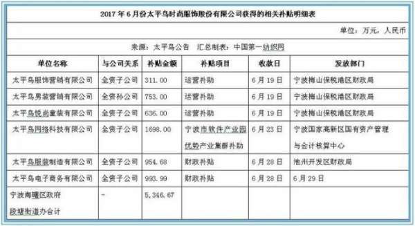 宁波太平鸟时尚服饰股份有限公司(以下简称“公司”)部分全资子公司、孙公司于2017年6月19日至2017年6月29日期间陆续收到政府各类大额补贴合计5346.67万元,相关补贴明细如下: