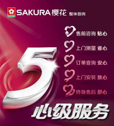 樱花整体厨房自1986年,由中国台湾的卫厨品牌樱花首次推出,同时,推出“携手”服务,“携手”服务注重倾听了解每一位消费者的个性化需求,充分尊重每一个家庭不同的生活习惯与爱好,让消费者参与到厨房的设计中,由樱花整体厨房需求顾问指导,为每一个家庭提供最佳设计方案,使厨房与家庭个性相契合,实现实用与美观兼具的厨房新生活,将消费者对于厨房的美好创想一一实现。更推出售前咨询、上门测量、订单查询、上门安装、终身售后的贴心、省心、安心、放心、舒心的五心级优质服务,携手创想,用心满足消费者的真正需求。无论售前、售中还是售后,全程体验优质服务!