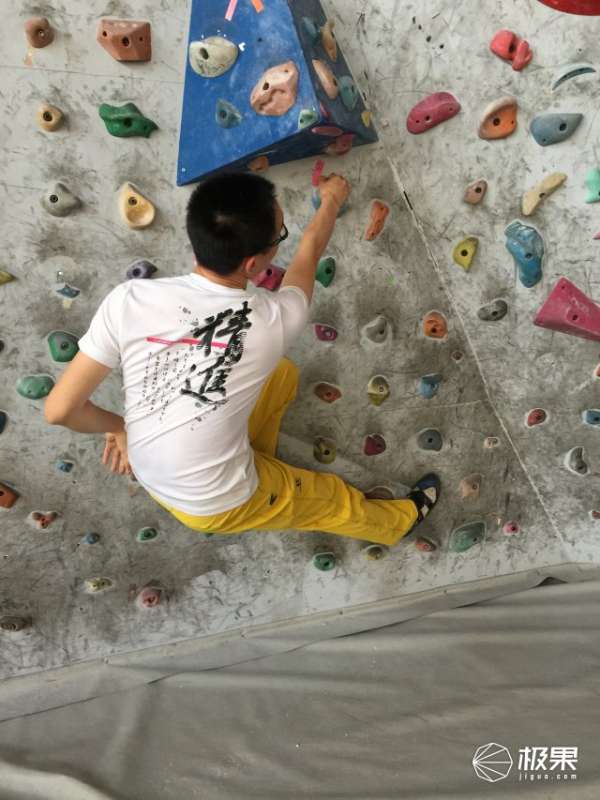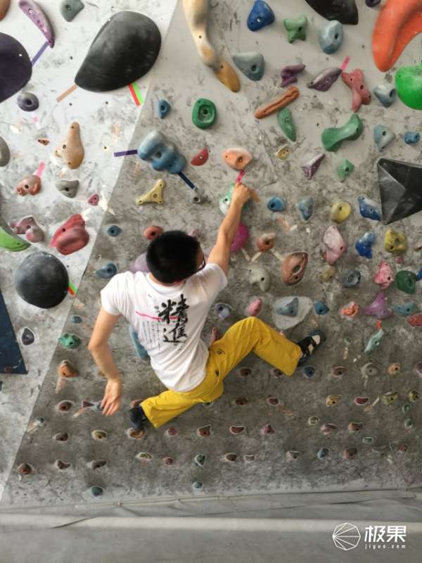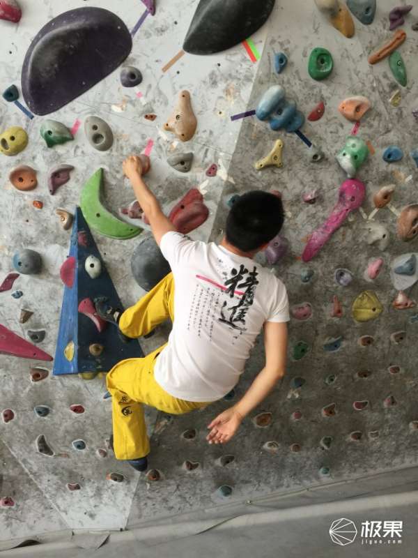 旧旧的9A上面有着镁粉的痕迹,配着抱石墙的背景,加上棱角分明的上身肌肉,很有范儿!