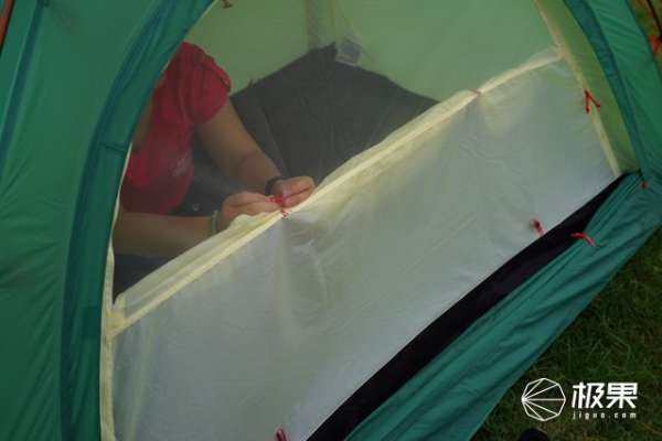 如果将门帘打开,还有专门的扣件进行固定,这样不至于拖到地上。内帐的门帘也是同样的设计,而且上面有一层纱网,在开着透气的同时也能有效防止蚊虫的侵袭。