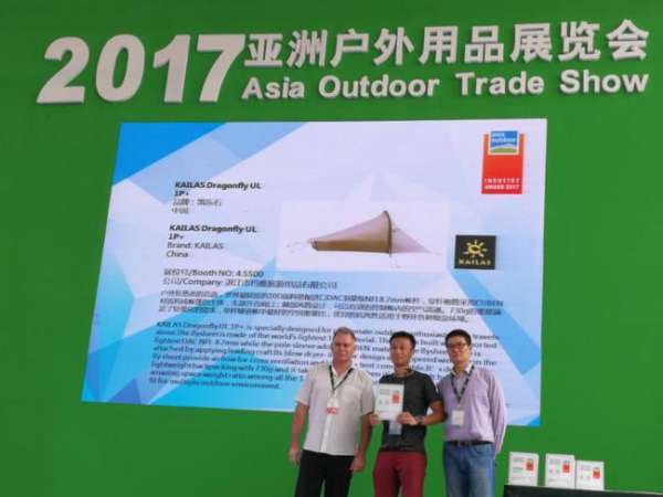 当天下午,第八届亚洲户外产业大奖颁奖典礼在2017亚洲户外展现场成功召开。亚洲户外产业大奖是由亚洲户外展面向户外优秀产品招募,并权威发布的年度重磅奖项,2017年共27件优秀的产品参加评选亚洲户外产业大奖,其中 KAILAS凯乐石品牌的三件专业产品(Rock Master 38L攀岩背包、Airo超轻攀登头盔、Dragonfly UL 1P+蜻蜓UL野营帐)在众多参选产品中脱颖而出,一举斩获三项大奖。