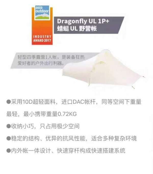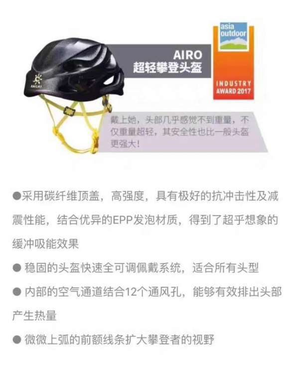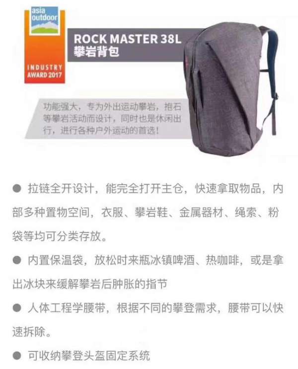 近年来KAILAS凯乐石,以“轻量化革命先锋”为己任,频频在新品研发上发力,此次获奖的三件专业产品都受到评委会的高度认可和评价。KAILAS Dragonfly UL 1P+蜻蜓UL野营帐专为狂热的户外爱好者的双人出行而设计,采用目前世界上最为轻质的10D材料与最为轻量的进口DAC羽量级NFL帐杆,构成整顶帐篷的主体,其收纳体积小巧,只占用极少的空间,整重只有950g,达到双人帐中最佳的空间重量比。内外帐一体设计、快速穿杆组成快速搭建系统,得益于隧道帐稳定的结构,优异的抗风性能,适用于野外各种复杂环境。KAILAS Airo超轻攀登头盔是一款全新一体EPP发泡材料成型符合亚洲人头围需求的超轻量头盔,碳纤维顶盖具有极好抗冲击性和减震性能,满足攀登者对于安全和重量的极致追求。KAILASRock Master 38L攀岩背包针对攀岩者设计的功能强大专业款攀岩背包,亦适用于都市休闲各种运动出行,内置保温袋和外置头盔收纳在细节处彰显专业。
