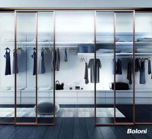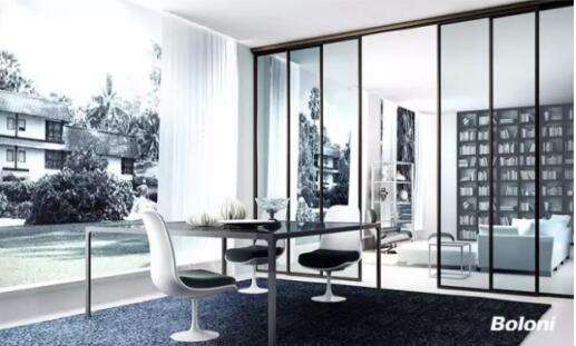 博洛尼移门由意大利设计师设计,延续了“少即是多”的风格理念,极致简约。从视觉上,空间有种无限延伸的错觉,金属材质与玻璃搭配又透露着低调奢华,简约的边框与玻璃门却是高科技的结晶。