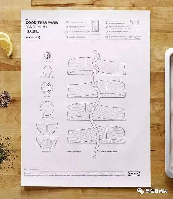 除了站在家居、时尚界的风口浪尖,城会玩的宜家还在最近的加拿大厨房展上,趁势推出了一本打破传统的天才料理食谱《Cook This Page》,以一张纸拯救看到配料表和步骤就头痛抓狂的厨房杀手们。消息一出,厨房杀手们顿时欢欣雀跃,宜家的头顶又多了一圈悲天悯人的光环。