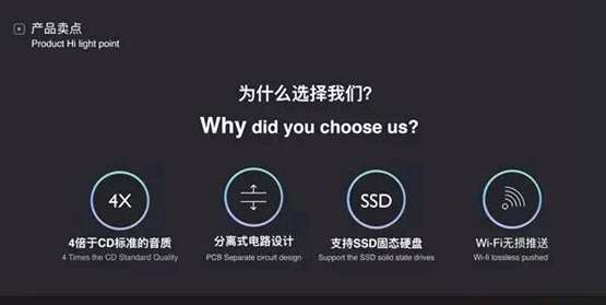 MEISTER音悦大师支持4倍于CD标准的音质载体,采用了分离式电路设计,支持SSD固态硬盘拓展,支持WIFI无损推送。