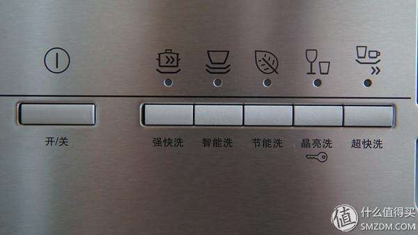 面板的左边是开关以及五个清洗程序(强快洗、智能洗、节能洗、晶亮洗、超快洗)的选择按钮