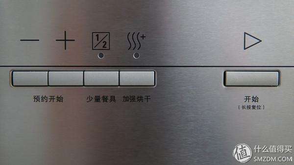 面板右边是预约定时按键、少量餐具选择按键(餐具很少的时候使用,省水省电省时)、加强烘干按键(最终漂洗时水温升高并延长烘干时间)和开始按钮(长按复位)。