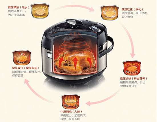 产品特性:立体烹饪技术;十项安全保护;五步加压技术;高灵敏感温探头