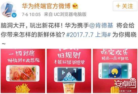 不过,就在次日6号上午,华为公司也微博声称,将携手肯德基于7月7日为用户带来全新体验。虽未表明详细内容,但双方的跨界合作也让华粉充满期待。