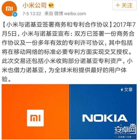 7月5日小米公司官方微博发布声明,宣布与手机界老大哥诺基亚达成一份多年有效的专利许可协议。业界人士认为,小米此举是为进军国外市场打好坚实基础,不少米粉还提前为其取了一个“糯米”的可爱昵称。
