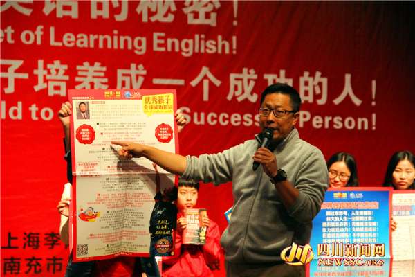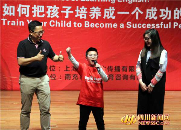 4月16日,李阳老师正在鼓励一名孩子大胆的喊出英语,为全场的孩子和家长作示范。