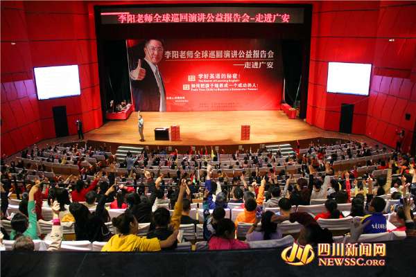 四川新闻网网广安4月17日讯(田祖国 ?羽 文/图)4月16日,李阳疯狂英语全球巡回公益演讲报告会走进广安,“李阳疯狂英语”创始人李阳老师亲亲临现场主讲,让广安2000余多名学生和家长感受了“疯狂英语”的独特魅力。