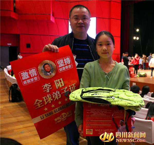 4月16日,一位家长带着孩子领取到李阳老师为他们赠送的书籍,以及颁发的《弟子证》向记者展示。