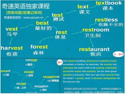与疯狂英语、新东方英语不同,奇速英语重抓“词汇”和“阅读”。因为英语学习,单词是基础,要想盖好英语的上层建筑,单词肯定必不可少。为了帮助学生能够更好更快地记忆单词,奇速英语采用的思维导图故事记单词能够7天记忆小学800、初中1600和高中3500单词,让学生7天学会三年单词,英语阅读又快又准。