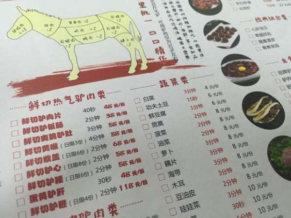 另外,他们的匠心还体现在独特的涮肉方式上。为了让顾客品尝到驴肉的绝佳口感,他们不仅将驴肉分成18个不同的精华部位,而且还通过长时间的反复内测,找到了不同部位驴肉最佳口感的涮烫时间,进一步标准化凝结而成他们独特的涮肉大法,并通过每一道菜的盘签及餐单上进行一一标注,除了让顾客觉得新奇之外,也确实让顾客体验到了驴肉的最佳口感。