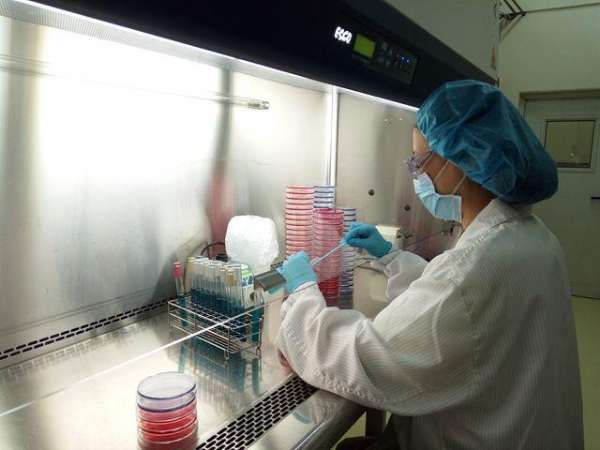 工作人员在生物安全柜进行微生物转接培养,以便监控产品质量