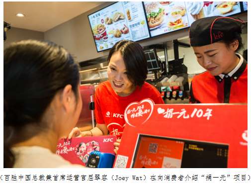 “需要为您加上一元的爱心捐款吗?”张梦雪站在柜台后笑容可掬地向点完餐的顾客说道,而屈翠容则在柜台向消费者详细介绍什么是“捐一元”项目。这位百胜中国总裁兼首席运营官向每位顾客悉心讲解着捐出的这一元钱的去处:“捐一元是由肯德基所属的百胜中国发起的一个公益项目,今年是这个项目运营的第十个年头。您的一元爱心捐款将变成鸡蛋和牛奶,用来改善贫困地区儿童的营养状况。”
