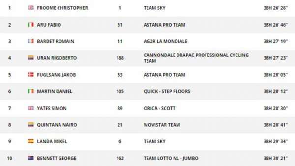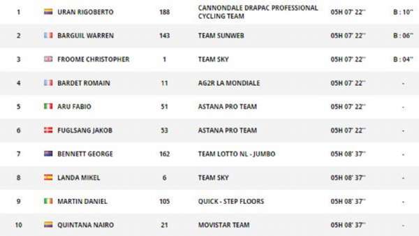 总成绩榜重新洗牌,弗鲁姆继续保有总成绩领骑衫,阿鲁、巴代分列二三。基特尔保有绿衫,西蒙·耶茨保有白衫,巴吉尔凭借突围拿到圆点衫。总成绩前六并未拉开显著时间差距,只是阿鲁与巴代计时能力稍弱,想要冲击总冠军需要在高山赛段殊死进攻。第一周巴尔维德、萨甘、卡文迪什、托马斯、波特、德玛尔相继退赛被罚下被关门,第二周剧情如何上演?