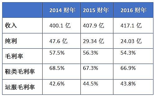 盛百椒用「悲情」方式扛下转型失败的责任,但其实百丽正走在越来越好的路上。刚刚过去的2016财年,百丽一口气关掉了593间鞋店,从2016年12月至2017年2月底止的第四季度,鞋类同店销售经过近两年的双位数跌幅,首次收窄至单位数,下滑约6.2%。这直接帮助2016财年盈利跌幅由2015财年的38.4%收窄至18%,收入增加2.3%至417.1亿元。更值得关注是,百丽新拓展的运动、服饰业务业绩抢眼,2016财年收入首次超越鞋类收入,占比达54.5%,盈利贡献进一步提高,甚至获得大行高盛称赞,认为运动服装业务可能成为百丽的新盈利动力。
