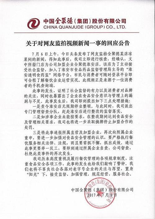 中国全聚德股份有限公司发文回应