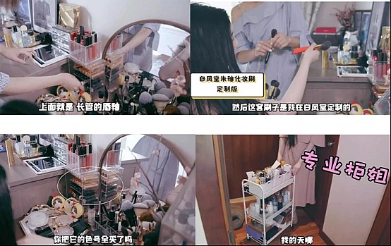 张辛苑的梳妆台上,整齐地摆放着各种化妆护肤品,多到腾不出空地,其中,白凤堂专门为她定制的化妆刷,她还几乎买齐了全部色号的口红。