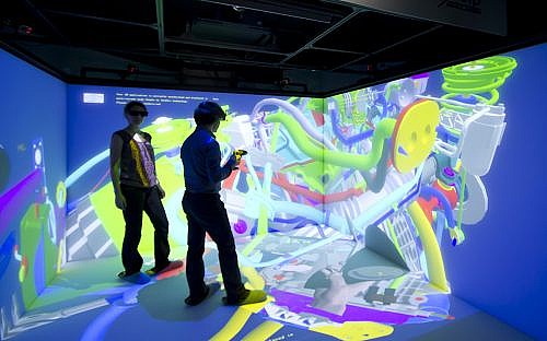 三面墙壁和地面投影加强3D 环境感和立体音效,Cave 墙壁上有跟踪传感器捕捉使用者在房间内的动作,专用的眼镜根据捕捉到的动作形成图像。戴上眼镜,你就感觉进入了“墙内的世界”。