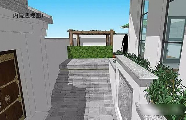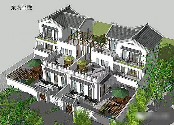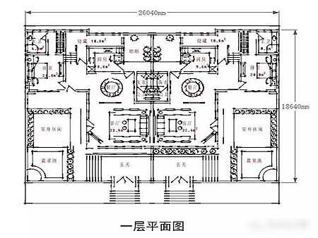 这个中式小院宽32米,长26米,建筑开间26米,进深18.6米,一层层高3.3米,建筑面积268平米,设有玄关、客厅、厨房、餐厅、卧室、储藏室、公共卫生间,二层建筑面积182平米,层高3米,有卧室3间,均带独立卫生间,有大大的露台以及阳台,三层建筑面积121平米,层高也是3米,设有客房2建,并带有露台。