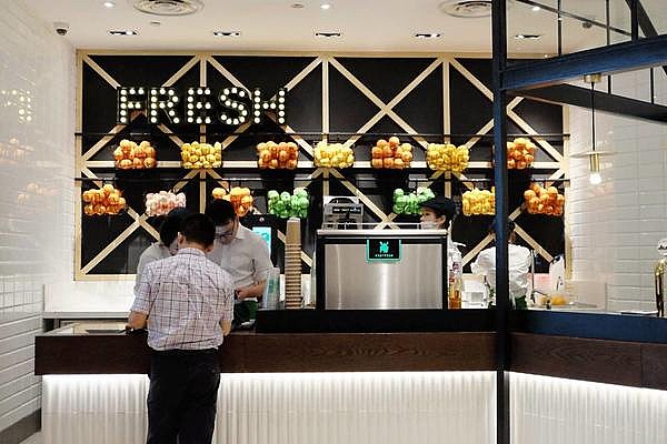 还设有鲜榨果汁柜台,苹果、柠檬、橙子都是现切现榨。