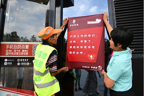 肯德基店内的户外工作者休息区放置有防暑降温药品箱,见3位保洁员进店,员工们热情地端来三杯温水,并打开藿香正气口服液让他们喝下去。店内清凉适宜的温度,舒适整洁的休息椅,令3位保洁员感到舒心。但他们只休息了几分钟就要离开,耿师傅说,方新村一带人流量大,路面垃圾随时都要清理,这也是工作需要。临走前,店员邀请他一起在店门前张贴“爱心一杯水”公益行动标识,告诉更多的户外工作者:“天热,辛苦了,请进来休息休息,喝杯水吧!”