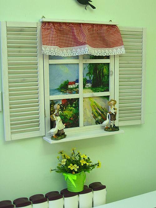 方法一:如果家中有一面位置恰当的墙,可以用假窗做装饰,窗外美景用好看的风景图制作。这样精致小巧的一扇假窗为房间平添一丝灵动活力,仿佛家就与世外桃源相连。