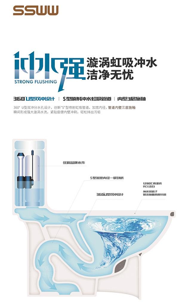 \u00A0 \u00A0 浪鲸卫浴提供的马桶采用喷射虹吸式冲水,冲水力度更加彻底强劲,管道内部施釉,不易挂污且容易清洗。造型小巧简洁,在卫浴间里不占据多余空间,便捷实用。
