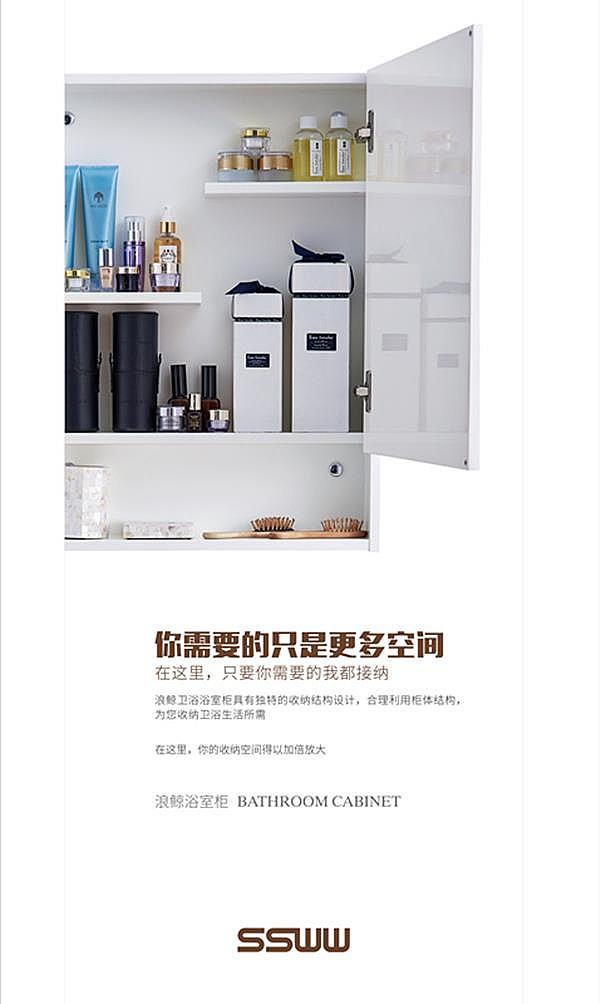 \u00A0 \u00A0 挂壁式浴室柜,强大的收纳功能为浴室节省了不少空间,,可以将浴室里的杂物收纳整齐。简洁时尚花洒的三件套更是卫浴间的标配。浪鲸卫浴的花洒喷头采用空气注入技术,在夏天冲凉时,让你足不出户,便可感受热带雨林般富含饱和氧离子的沐浴体验。