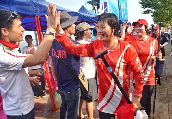 左一为女队的方金彩选手,她今年已经55岁了,还将代表广东龙舟队去参加在天津8月底举行的全运会开幕式!