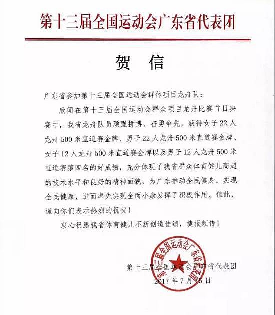 在广东省龙舟队获得骄人成绩后,第十三届全国运动会广东省代表团发来贺信:“这充分体现了我省群众体育健儿高超的技术水平和良好的精神面貌,为广东推动全民健身,实现全民健康发挥了积极作用。”