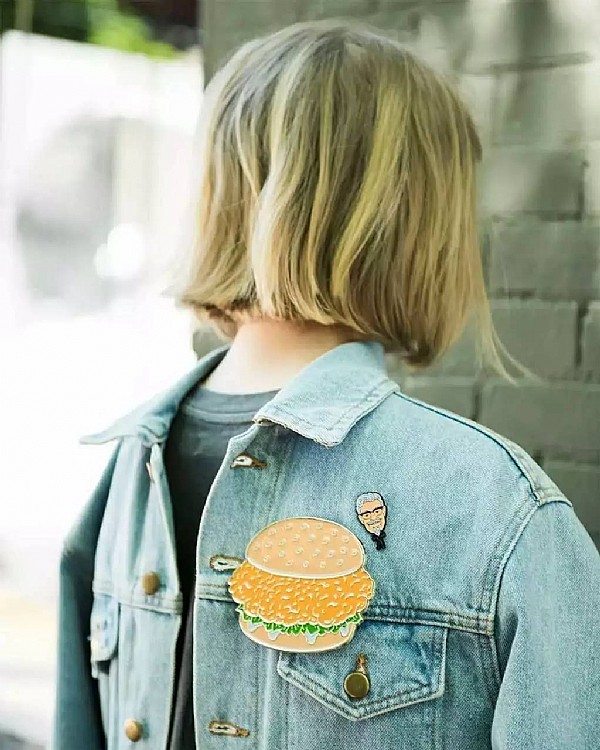 超大的??汉堡胸针,肯德基老爷爷形象的别针,经典的丝带领结,原味吮指的项链,每一样都超高颜值,这是要开挂了吧。