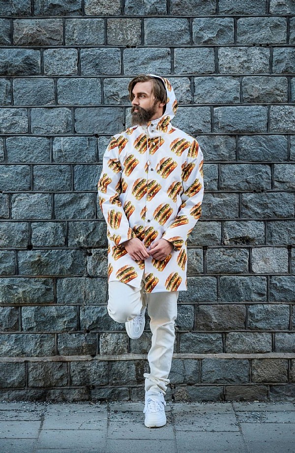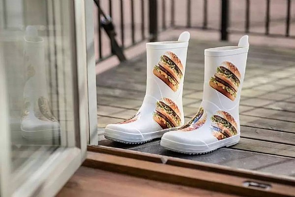 还贴心的推出了雨衣雨鞋,不过就是这印花也太逼真了,别的都是象征性的Q版汉堡,这直接把“图片仅供参考”的美食图给放上去,也太“凶残”了吧。