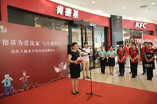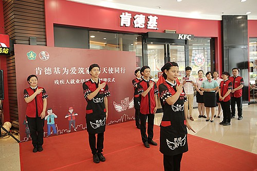 7月17日,沈阳肯德基惠工餐厅举行了“天使餐厅”的授牌仪式,辽宁省残疾人联合会理事孙建春女士为沈阳肯德基惠工餐厅授予“残疾人就业培训基地”牌匾。这标志着辽宁首家肯德基“天使餐厅”正式成立,肯德基关爱残障人士的公益梦想正在一步步实现。
