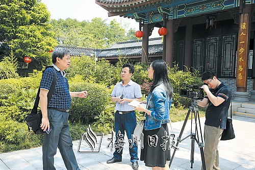 采风团记者在惠州西湖公园丰湖书院采访。