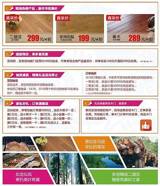 本次嘉年华活动中,安信地板将精选出的百余款精致地板展示在现场。据悉,深受用户们喜爱的非洲花梨、二翅豆、橡木和多层实木复合地板及强化地板等爆款产品,在活动中,安信地板将继续以直采价让利给消费者。一直深受用户好评的非洲花梨自由长地板。在本次活动前,安信地板也收到了许多用户购买此款地板的需求,故本次活动为让更多的用户能够购买到此款产品,安信地板已备足产品,超值价格回馈用户。非洲花梨自由长地板199元起,秉承了红木优良传统的非洲花梨,俗称:刺猬紫檀。融入了现代和古典意蕴,整体光泽度饱满,香气淡雅清新,纹理错落有致,花纹张扬且具有大将之风,浑然天成。因此深受广大用户的亲睐。