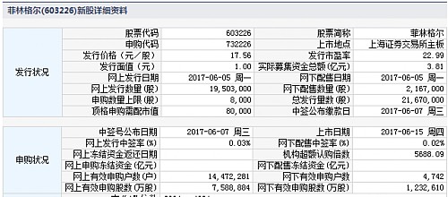 登陆资本市场的菲林格尔在2014-2016年分别实现营收6.55亿元、7.10亿元、6.95亿元,对应的净利润分别是4171万元、6723万元、7018万元。据菲林格尔披露2017年第一季度报中显示,2017年1-3月公司实现营收1.33亿元,同期增长30.25%,实现归属母公司股东净利润750.57万元,同期增长19.94%。而本次上市以15.56元/股作为发行价,开盘价25.29元/股,涨幅达44.02%,发行后总股本不超过8667 万股,由此可计算,菲林格尔的市值为21.92亿元。