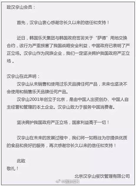 在这份声明中,汉拿山表明了自己与乐天无关的态度和立场,同时,也说出了一个让很多网友“震惊”的事实――“我们是百分百中资企业”。