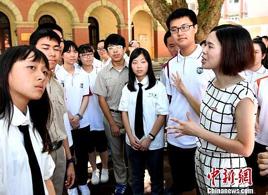 参加第十四届榕台青年夏令营的两岸中学生听取福州高级中学老师介绍该校百年校史。记者刘可耕 摄