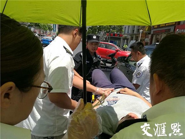 巧的是,镇江润州巡特勤队员正好巡逻到此,年轻的巡特勤队员高光泉见状,立即安排其中一名队员在周边疏导交通,一边让肇事轿车车主拨打120急救电话。接着,小高从车上拿下防暴盾牌,托着盾牌竖在自己的两脚之间,和另一名队员一起为伤者遮阳。而自己则一直在烈日下暴晒着。