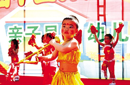 红黄蓝亲子园幼儿班小朋友们在表演舞蹈节目《开门红》