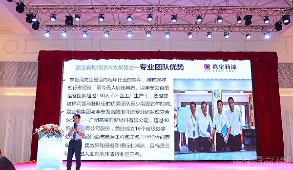 公司总经理李赉周首先分析了中国地坪行业的形势,随着中国经济的发展,地坪材料的运用普及率越来越高,特别是医院、学校、商场、体育馆、办公楼、地下车库、工业车间、厂房等基本已经全面化了,目前中国地坪市场规模已经达到200亿元以上,市场对地坪材料的需求仍然不断加大,地坪漆工业企业生产扩能举措不断,但仍然不能满足市场需求。中国地坪市场集中度非常分散,行业品牌知名度不强,导致产品良莠不齐,市场对地坪材料产品和服务的满意度非常低。所以,行业的品牌化、集中度将进一步提高,这给了嘉宝莉这样的知名品牌更多机会。