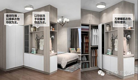 ▲L型多功能双面衣柜设计:针对厕所对着门的情况量身设计,行走畅通,功能齐全。