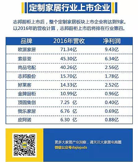 大家居电商圈了解到,2017年上半年,尚品宅配、皮阿诺、金牌厨柜、志邦橱柜等相继上市,整个全屋定制概念大火。目前上市的全屋定制已有9家企业,博洛尼作为一个最早的先行者,却只能眼睁睁看着后起之秀一个个实现IPO梦想。剥离了家装负担后,博洛尼的全屋定制能助力梦想家蔡明实现上市梦吗?