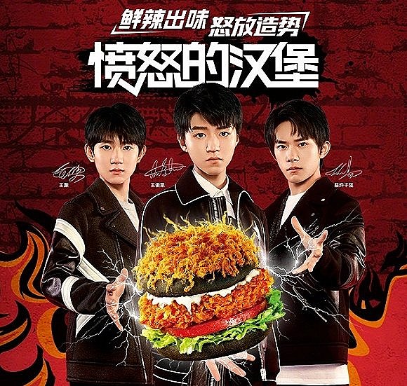 此次签下TFBOYS,肯德基也随即同期推出新品“愤怒的汉堡”——这是一款带有肉松的汉堡,你知道的,肉松、芝士与小龙虾已经成为中国市场的“网红保证”。必胜客的比萨上已经洒满了小龙虾,而这次肯德基又把肉松加进自己的汉堡中。配合TFBOYS的宣传,肯德基似乎也想把这款汉堡作为当季的主打产品。